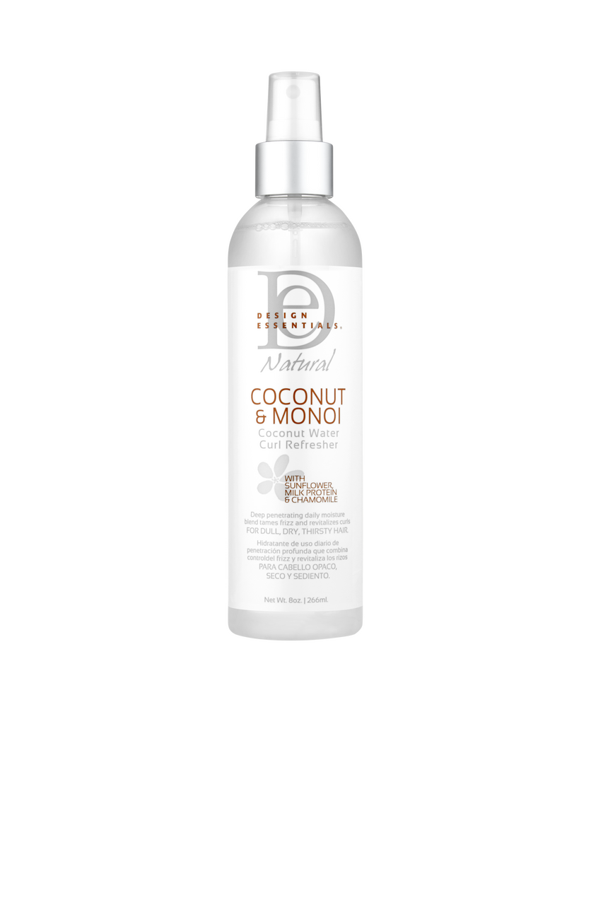 Design Essentials Coconut & Monoi Coconut Water Curl Refresher revitalizes curls with a triple-hydrating monoi moisture blend of coconut water, chamomile, and wild cherry. Lightweight silk proteins and a replenishing blend of active botanicals restore over-worked curls. Use this daily to quench thirsty curls and tame unwanted frizz.