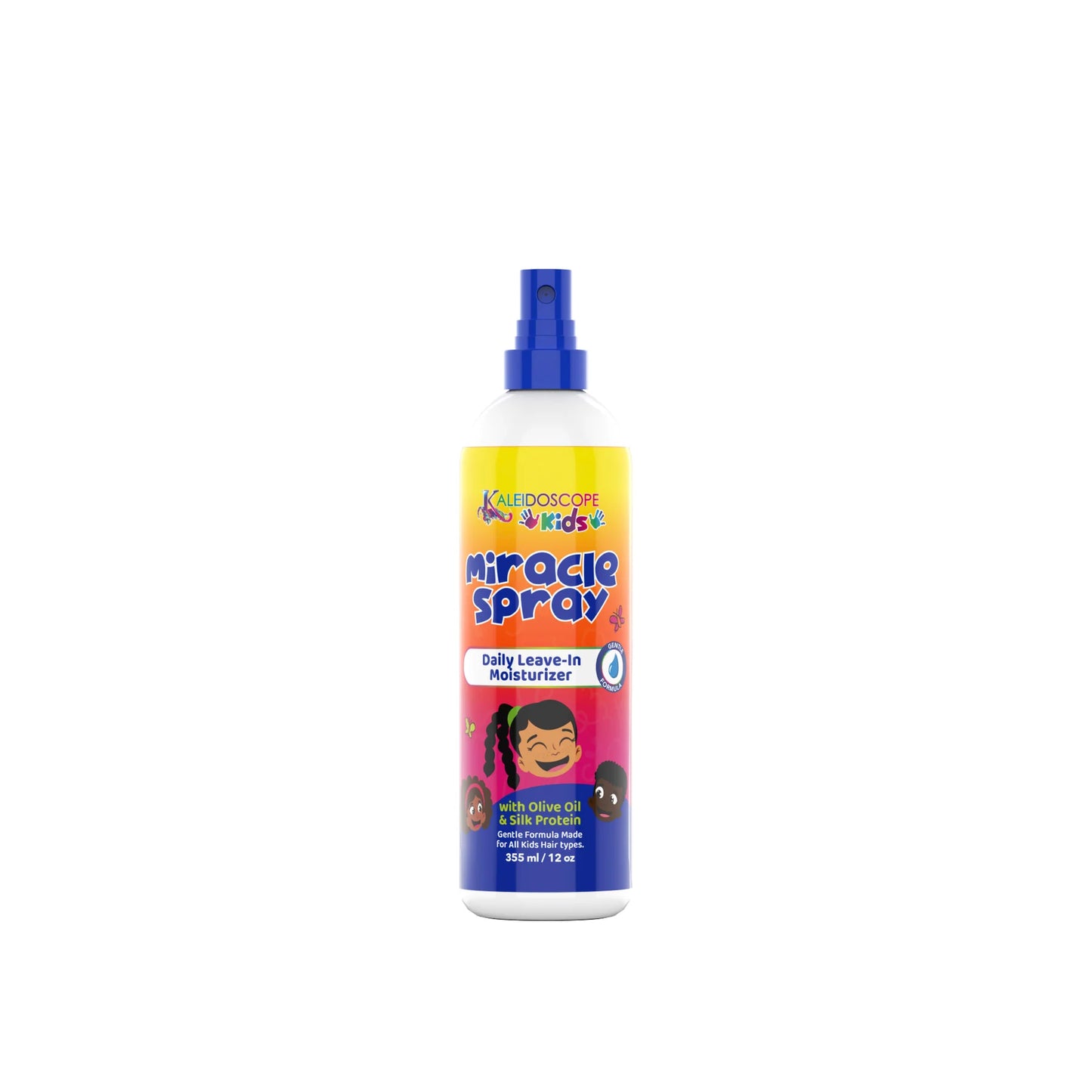 Kaleidoscope Kids Miracle Spray is infused with Olive Oil and Silk Protein to help support strong, healthy hair.